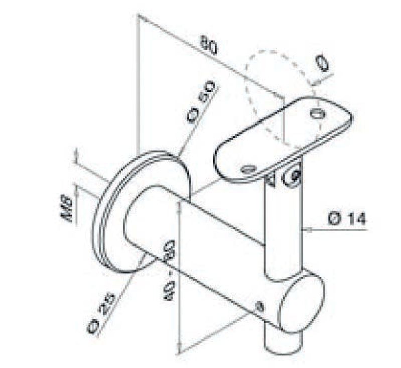 Montage muur: deze steun wordt d.m.v. één M8 stokbout en bijbehorende plug aan de muur gemonteerd.